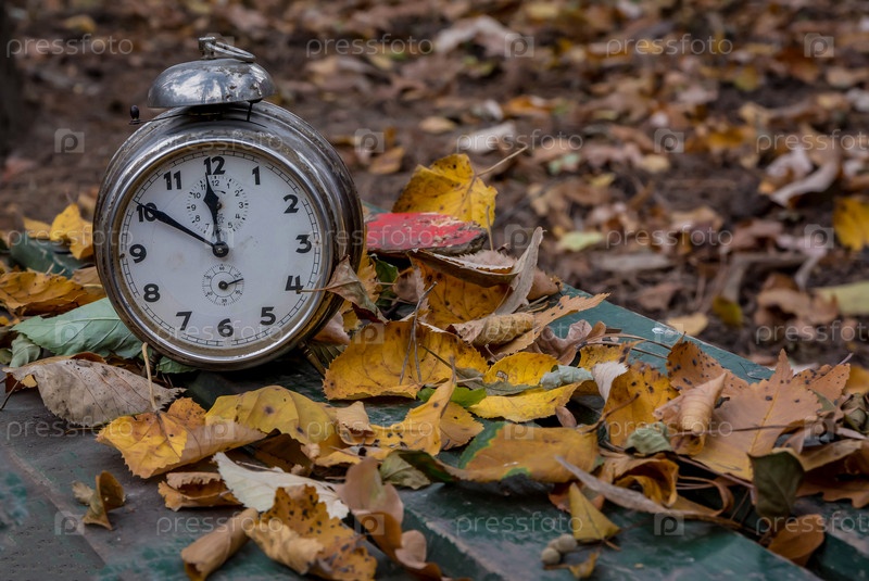 Старые часы на осенних листьях