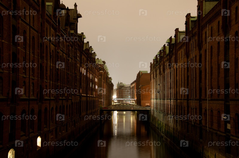 Вечерний вид на исторического района Шпихерштадт (Хафенсити) в Гамбурге, Германия