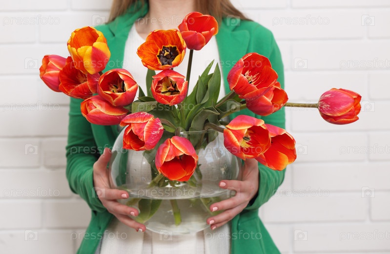 Женщина держит вазу тюльпанов
