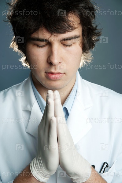 Молодой врач в перчатках молится