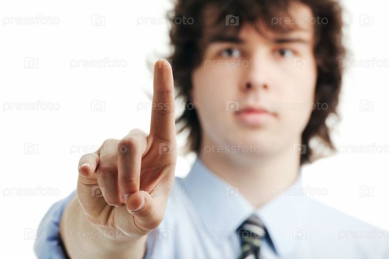 Симпатичный молодой менеджер нажимает на сенсорную кнопку