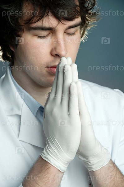 Молодой врач в перчатках молится