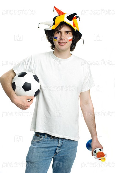 Футбольный болельщик с мячом и дудкой