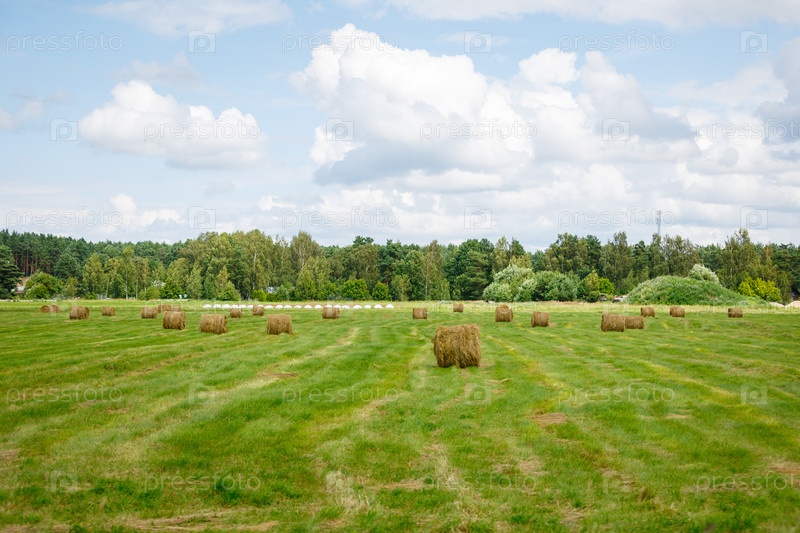 Зеленый луг с рулонами сена