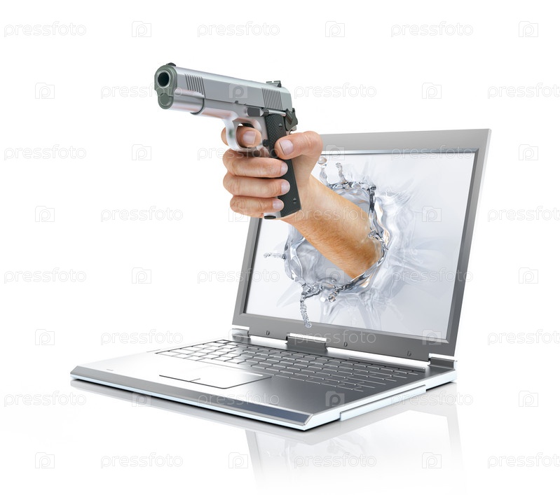 Рука с пистолетом из экрана ноутбука