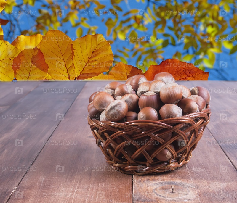 Фундук в корзине на фоне желтых листьев