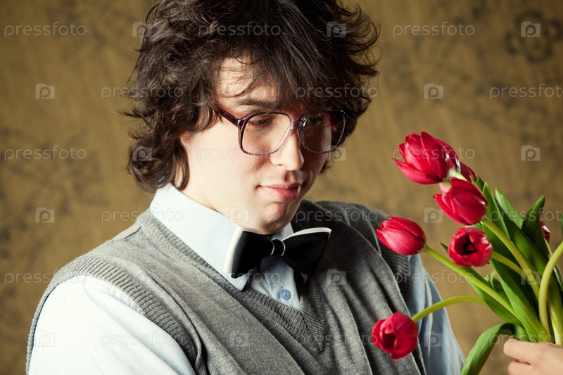 Молодой человек в очках получает букет тюльпанов