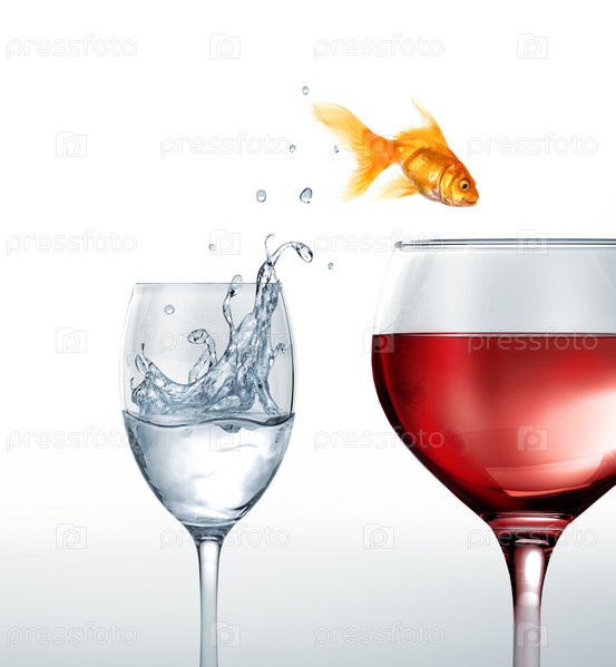 Золотая рыбка прыгает в стакан красного вина