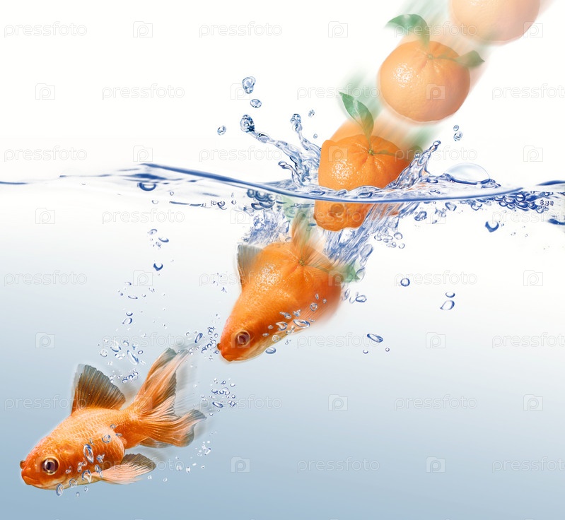 Апельсины превращаются в рыбок в воде