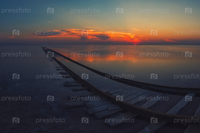 Закат на соленом озере и железная дорога