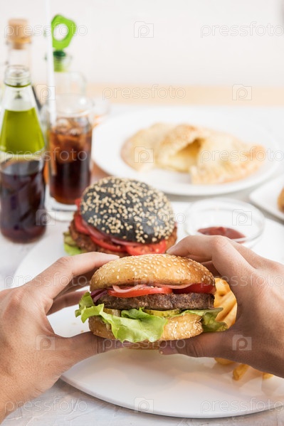 Человек ест гамбургеры