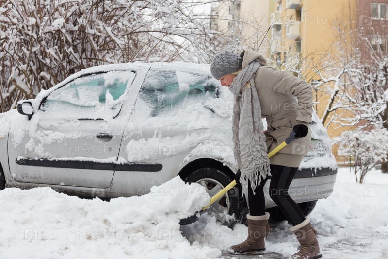 Женщина счищает снег