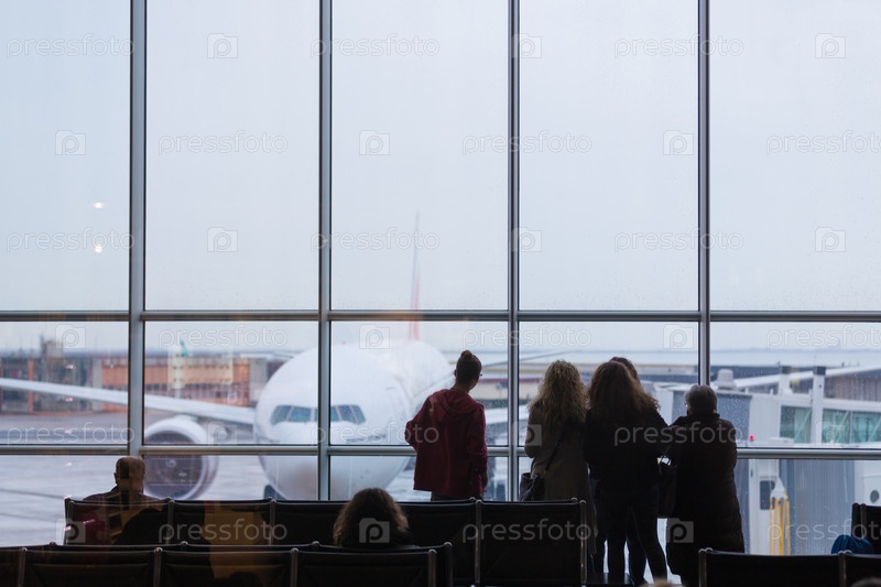 Люди, ожидающие вылета самолета в дождливый день