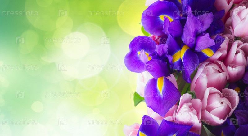 Синие ирисы и тюльпаны