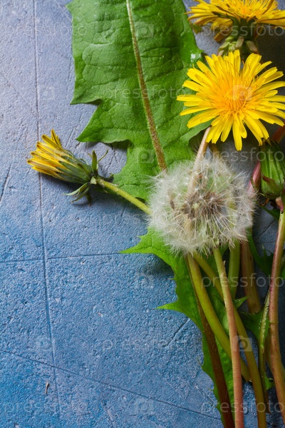 Свежий одуванчик на сером фоне
