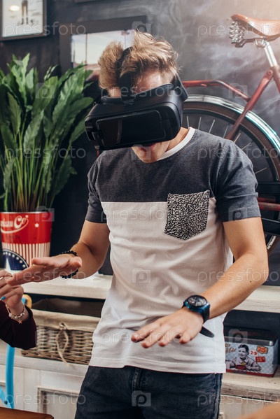Пораженный молодой человек в очках виртуальной реальности