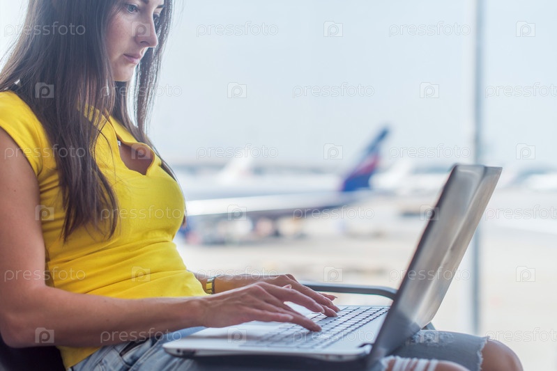 Молодая женщина с ноутбуком на коленях в аэропорту