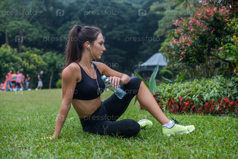 Девушка сидит на траве в парке отдыха после тренировки