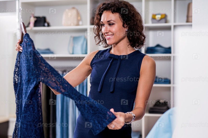 Элегантная молодая женщина ищет новое платье в магазине одежды
