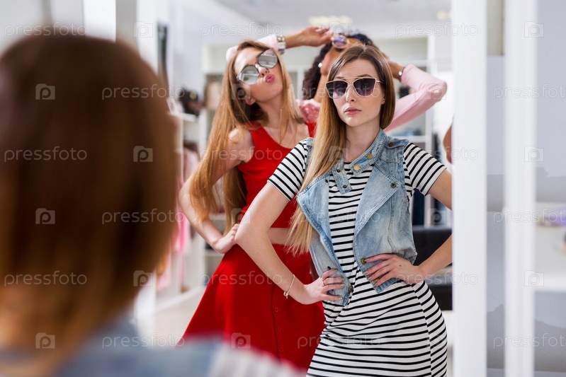 Веселые подруги в магазине аксессуаров
