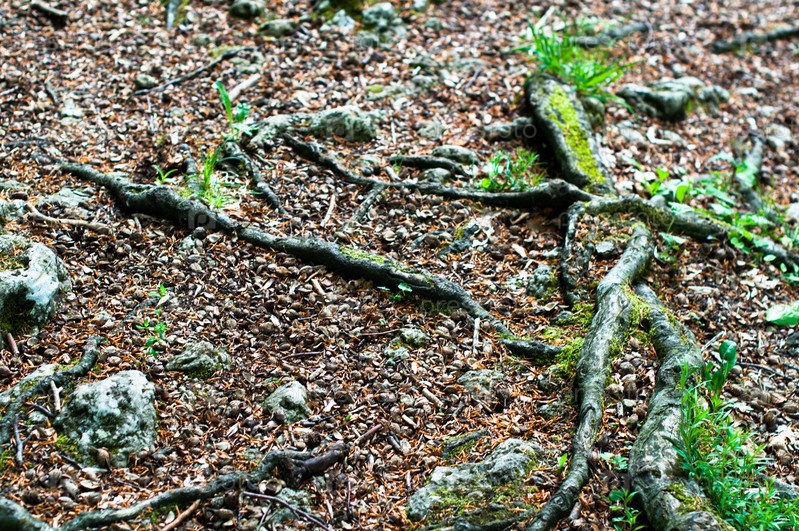 Мох, трава и буковые орехи на земле в весеннем лесу