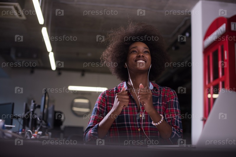 Девушка слушает музыку в офисе
