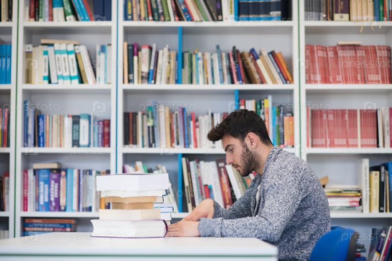 Портрет студента во время чтения книги в школьной библиотеке