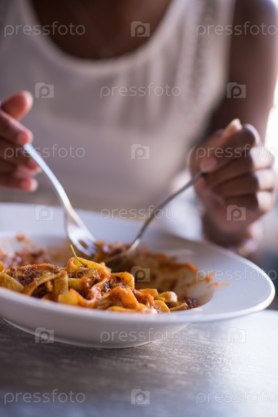 Девушка кушает макароны