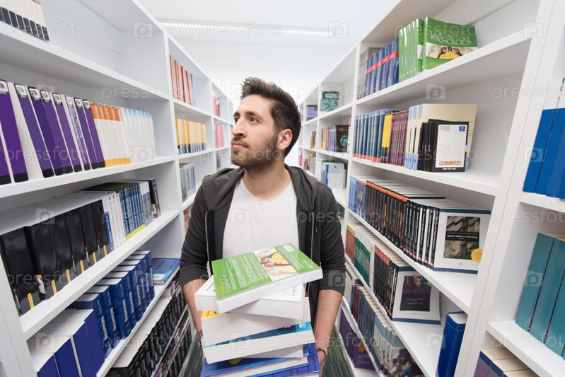Студент держит много книг в школьной библиотеке