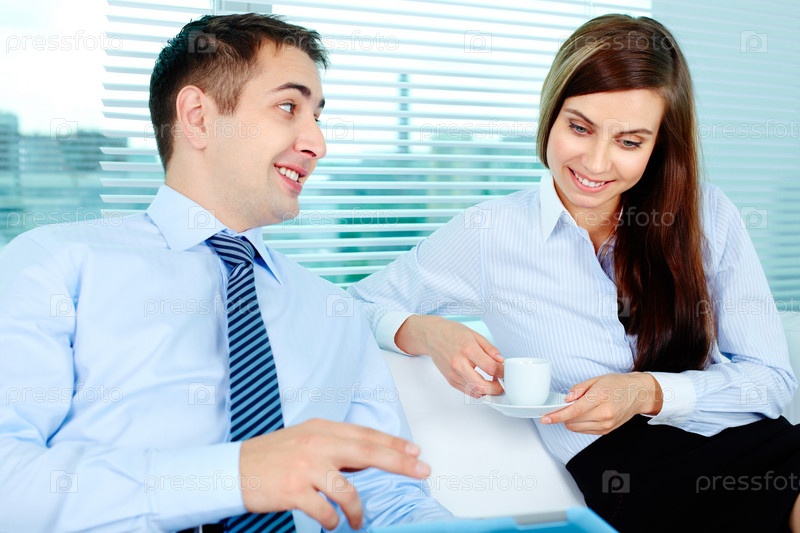 Деловые мужчина и женщина общаются в офисе