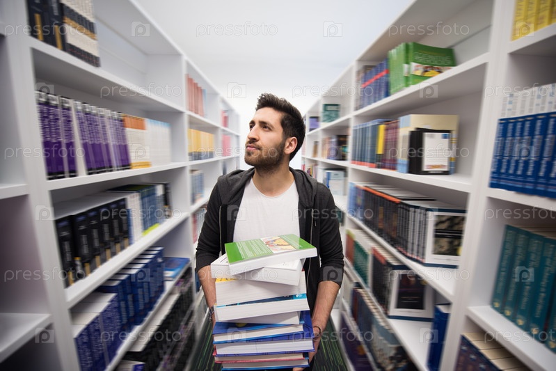 Студент держит много книг в школьной библиотеке