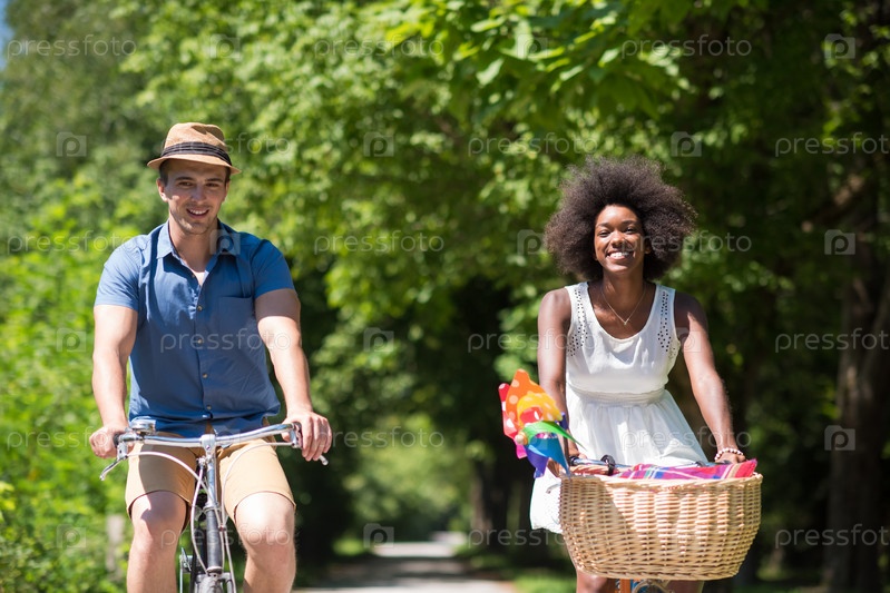 Молодая пара на велосипедах в парке