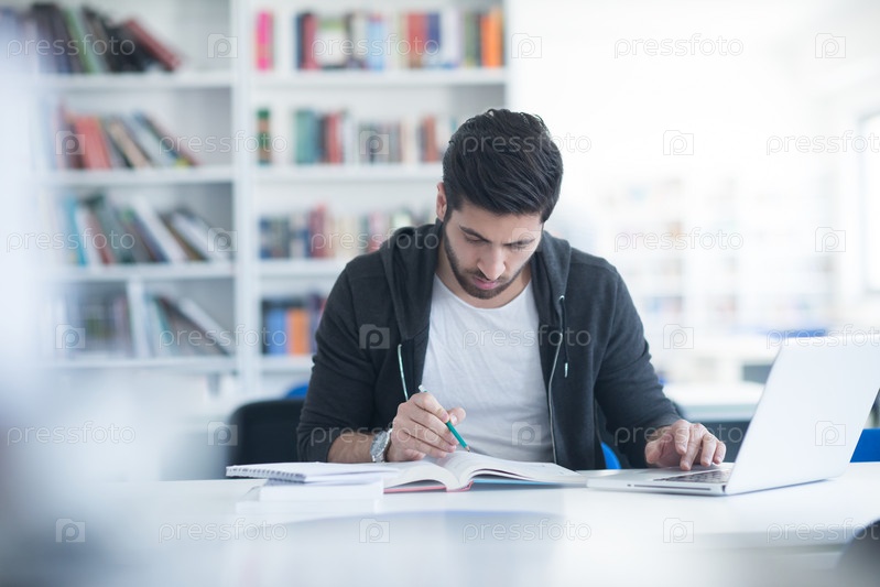 Студент в школьной библиотеке, используя ноутбук для исследования