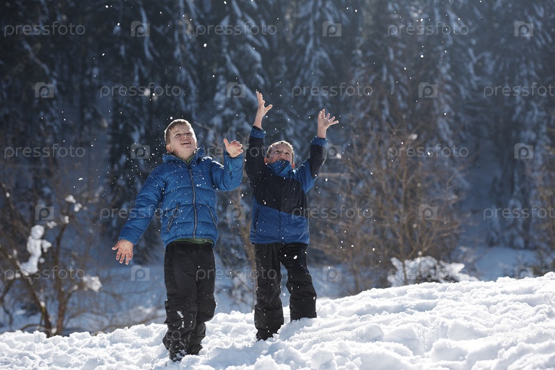 Дети, играющие со свежим снегом
