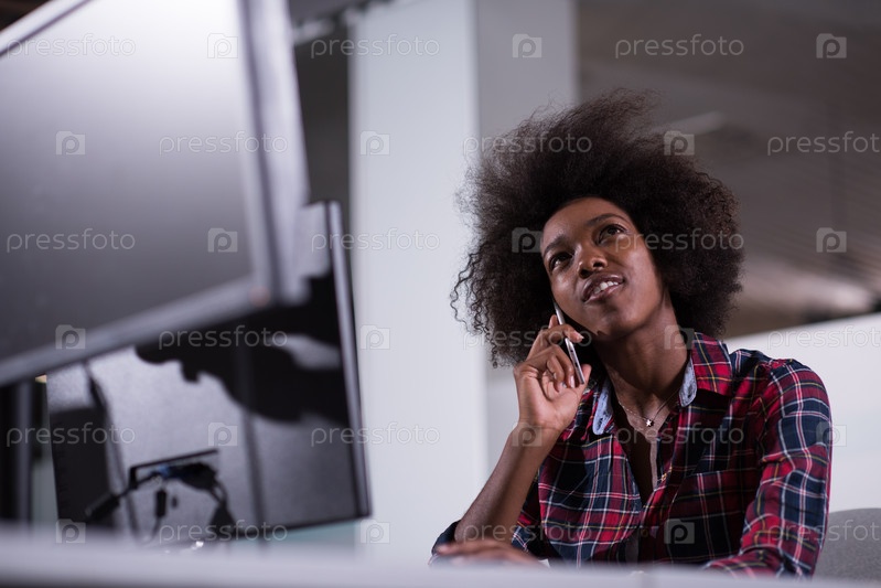 Молодая чернокожая женщина на своем рабочем месте в современном офисе