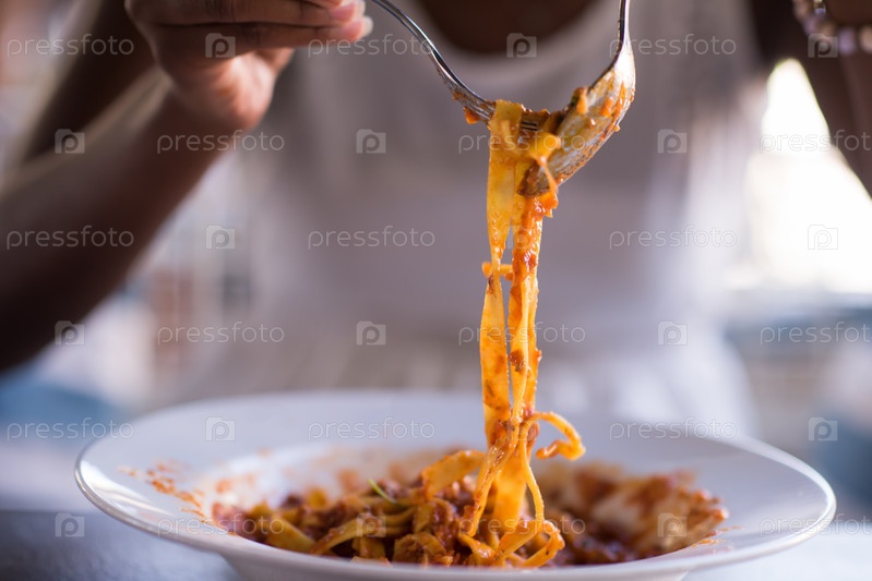 Женщина ест макароны