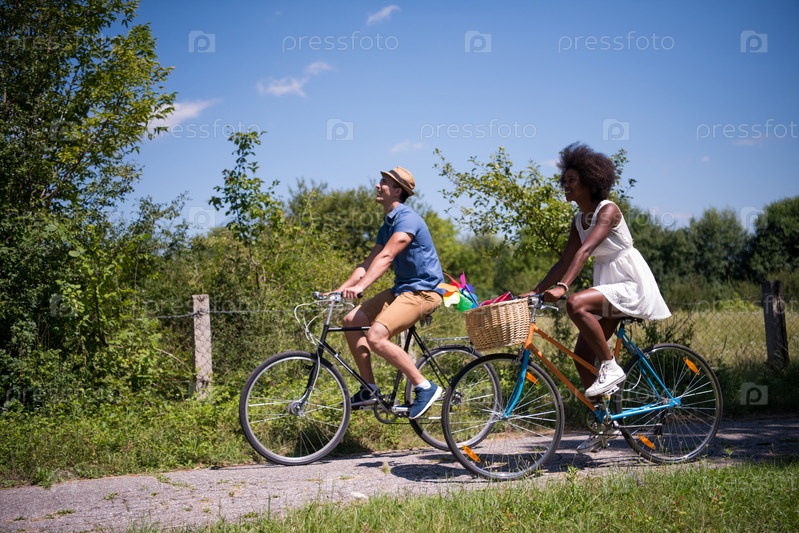 Молодая пара на велосипедах в парке