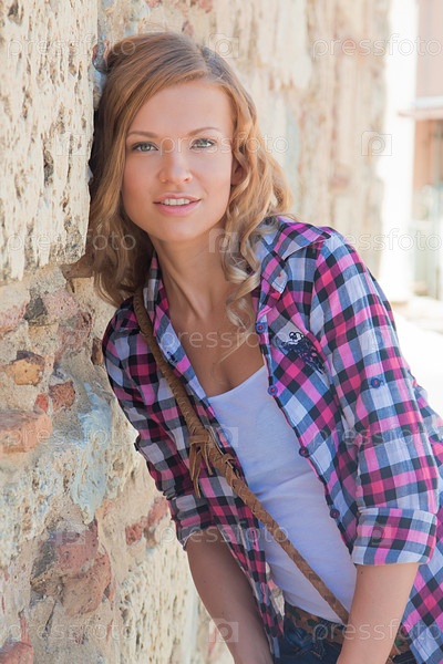 Симпатичная девушка в клетчатой рубашке стоит на фоне каменной стены