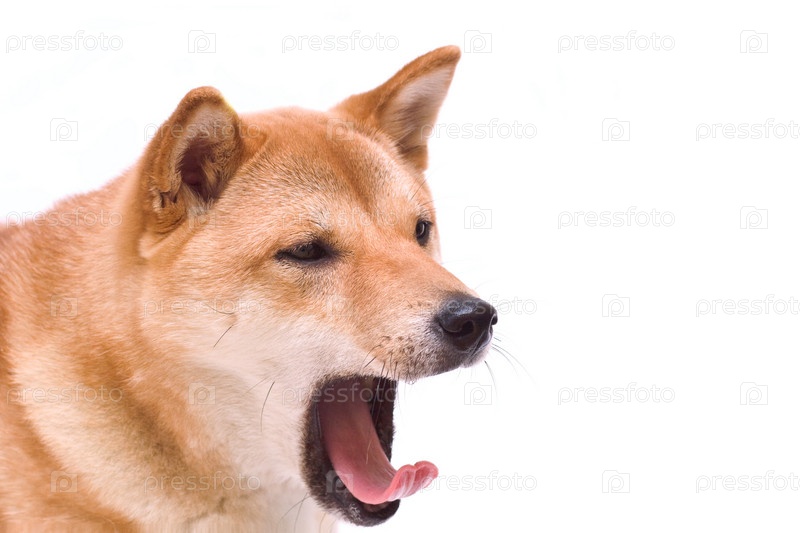 Зевающая рыжая собака на белом фоне