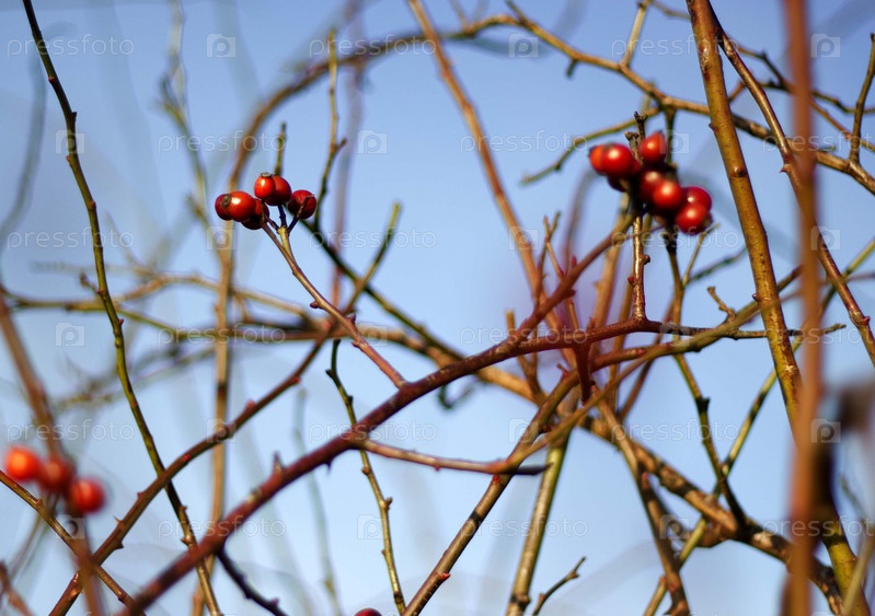 Сухие ветки с красными ягодами на фоне неба