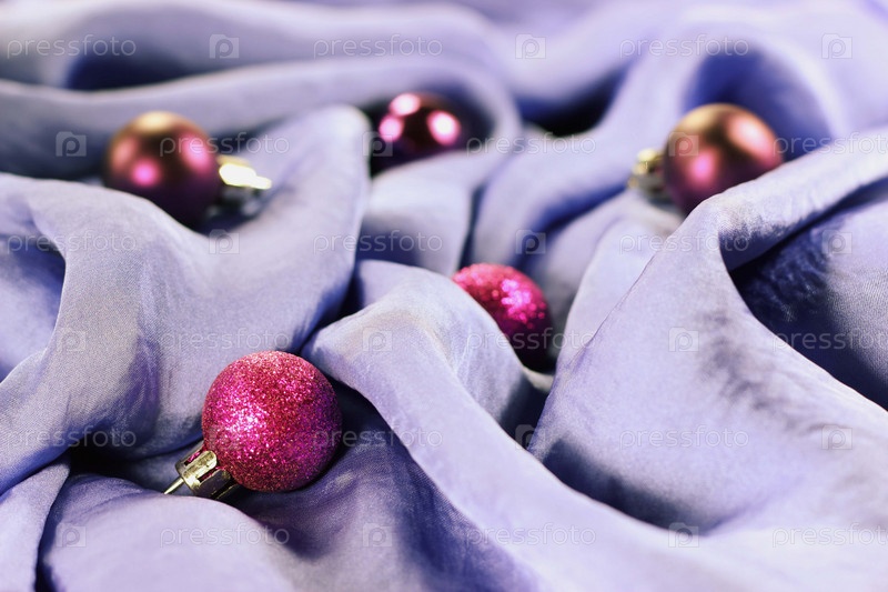 Несколько рождественских фиолетовых шаров на сиреневом шелке
