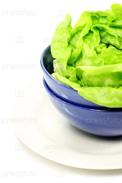 Зеленый салат в синей миске на белом фоне