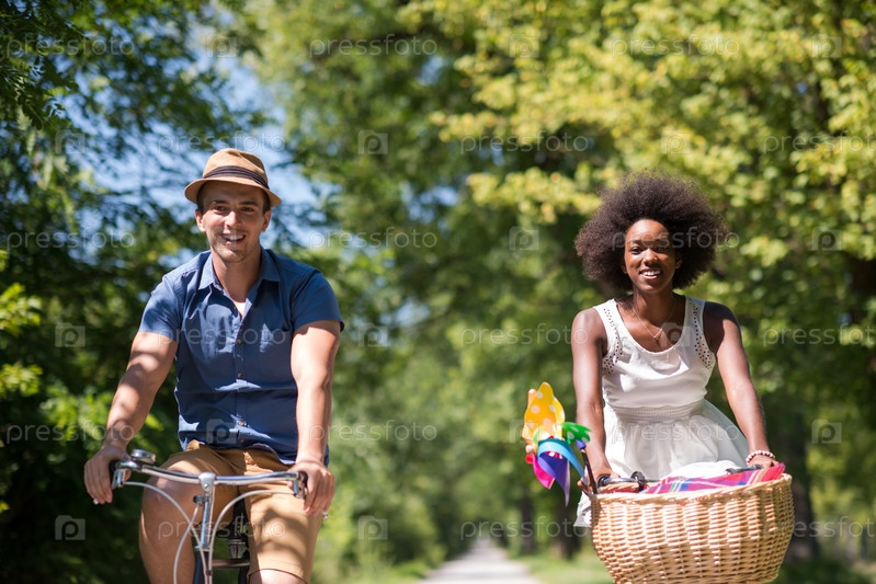 Молодая пара на велосипедах в парке