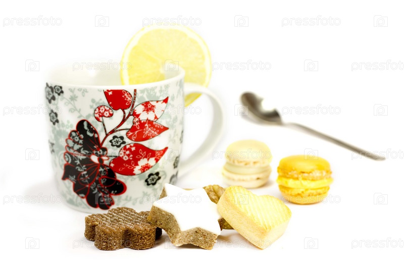 Печенье и кружка с лимоном на белом фоне