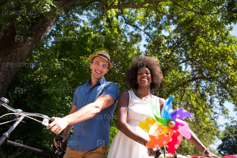 Молодая пара на велосипедах в парке