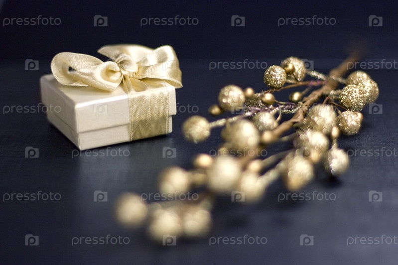 Подарочная коробка и декоративная ветка на темном фоне