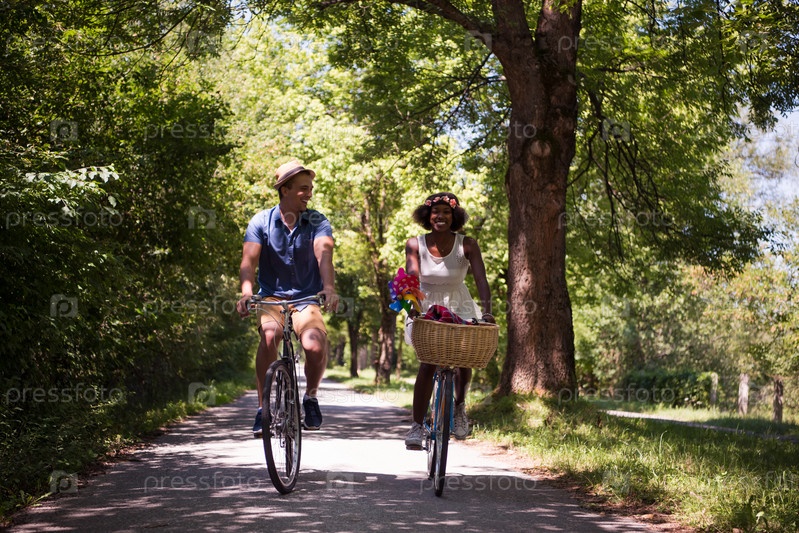 Молодая пара на велосипедах в парке