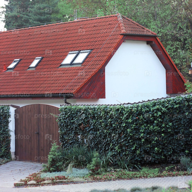 Дом с воротами и зеленой изгородью