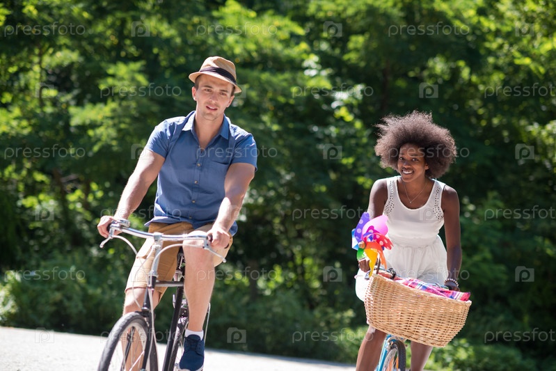 Молодая пара на велосипедах в парке