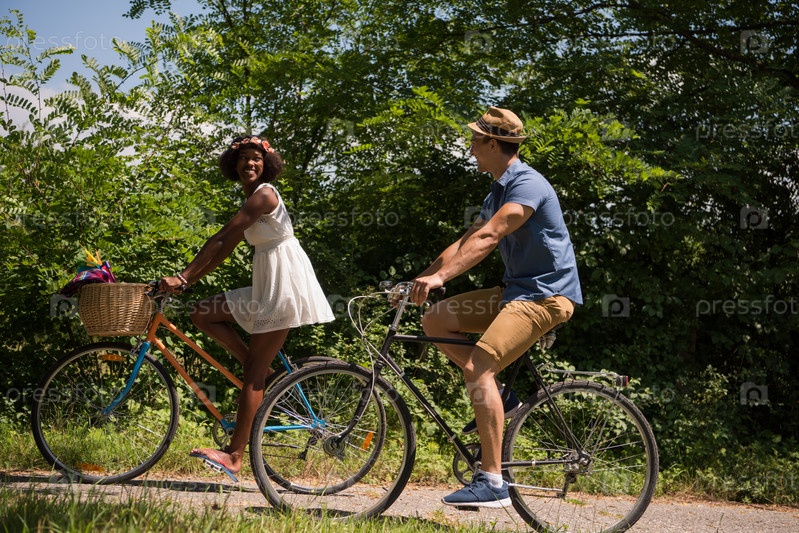 Молодая пара на велосипедах в парке